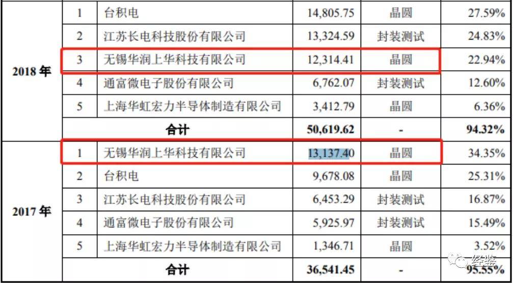 招股说明书披露,报告期内,无锡华润上华科技有限公司(以下简称“无锡华润上华”)前五大晶圆制造供应商,其中在2017年,艾为电子向无锡华润上华采购晶圆13,137.40万元。