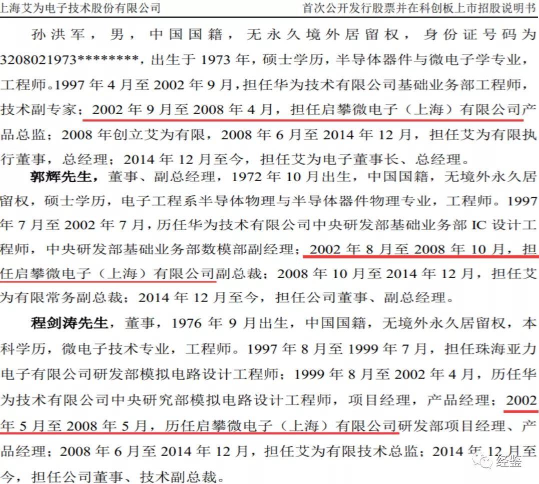 艾为电子另两位董事郭辉、程剑涛也存在类似的任职经历。其中,郭辉先生于1997年7月至2002年7月任职于华为技术有限公司;2002年8月至2008年10月,担任启攀微电子(上海)有限公司副总裁。