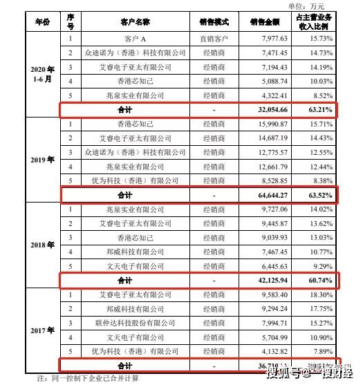 2017年-2020年上半年,艾为电子向前五大客户销售额分别为36,710.16万元、42,125.94万元、64,644.27万元、32,054.66万元,占当期主营业务收入比例分别为70.11%、60.74%、63.52%、63.21%。均超60%以上。