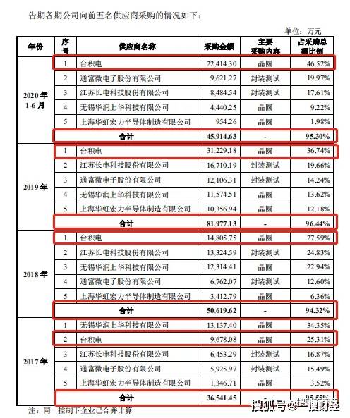 根据招股书信息显示,2017年-2020年上半年,艾为电子向前五大供应商采购额分别为36,541.45万元、50,619.62万元、81,977.13万元、45,914.63万元,占当期采购总额的比例分别为95.55%、94.32%、96.44%、95.30%。均超90%以上。