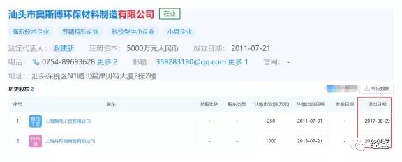 据工商资料显示,报告期内,上海飘纯工贸有限公司和上海丹布朗商贸有限公司(以下简称“上海丹布朗”)曾为唯赛勃全资子公司汕头市奥斯博环保材料制造有限公司股东。上述两家公司均在2017年6月9日退出,但在招股说明书中却未见披露。