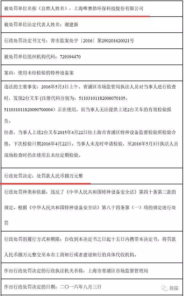 经鉴上市公司课题研究组了解到,唯赛勃在日常生产流程中曾存在漏洞。据上海市市场监督管理局官网公示,公司曾因使用未经检验的特种设备而被行政处罚8万元。