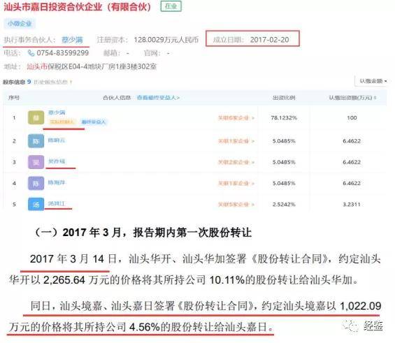 此外,汤其江、吴祚瑶和蔡少满三人均为唯赛勃持股平台汕头嘉日的持股合伙人,蔡少满占股则高达78.1232%。值得注意的是,汕头嘉日成立于2017年2月20日,当年3月14日便成为唯赛勃股东之一。