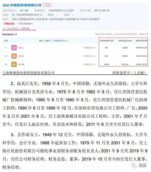 据工商资料显示,唯赛勃董事、核心技术人员汤其江先生和公司董事、财务经理吴祚瑶女士一直为汕头市境嘉贸易有限公司(以下简称“汕头境嘉”)的股东,该司主营业务与唯赛勃主营业务存在上下游关系。2016年12月23日,汕头境嘉发生一次股权变更行为,变更后汤其江持股2.52%,吴祚瑶持股5.05%,蔡少满持股78.12%。