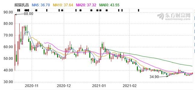 然而“出道即巅峰”,从此熊猫乳业股价一路下滑,2021年3月15日盘中曾一度探至34.90元/股的最低点。截止2021年4月7日,熊猫乳品收盘报37.74元/股,总市值为46.80亿元,仅为上市首日的60%。