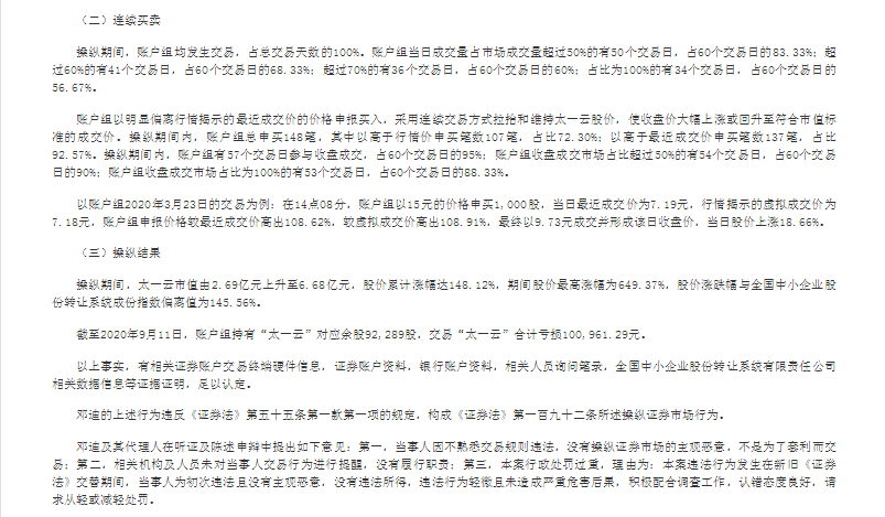 操纵期间,太一云市值由2.69亿元上升至6.68亿元,股价累计涨幅达148.12%,期间股价最高涨幅为649.37%,股价涨跌幅与全国中小企业股份转让系统成份指数偏离值为145.56%。