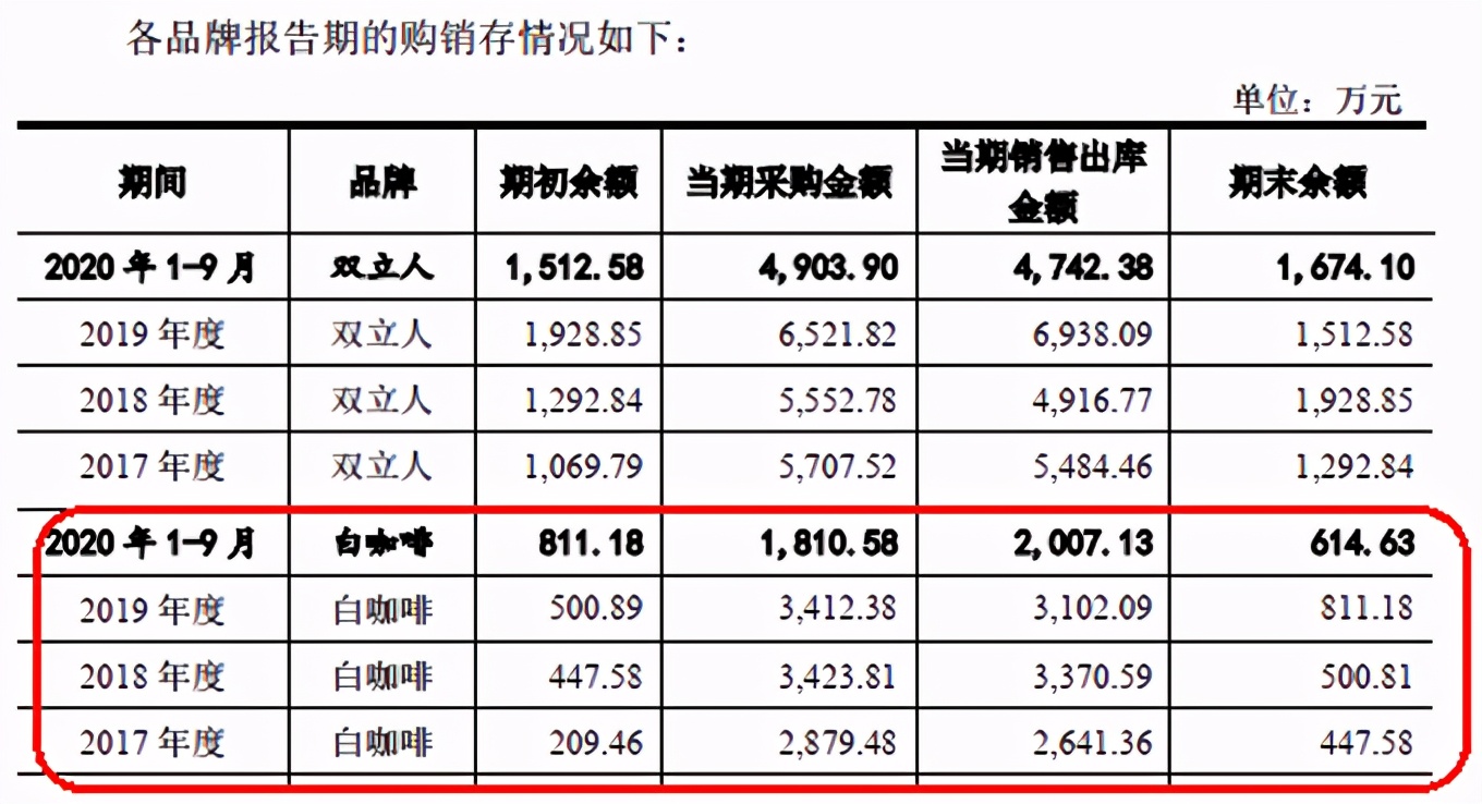 招股说明书“主要品牌购销存情况”显示,2017-2019年及2020年1-9月,旧街场白咖啡的销售出库金额分别为2641.36万元、3370.59万元、3102.09万元和2007.13万元。