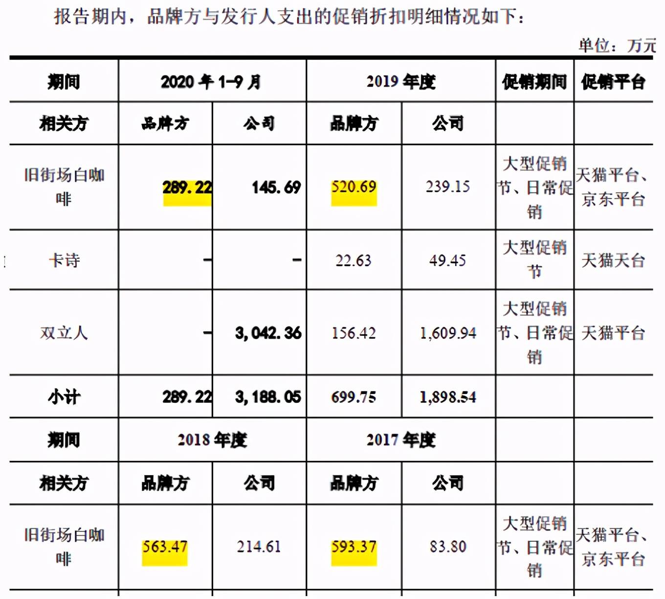 招股说明书“促销折扣情况”显示,报告期各期,旧街场白咖啡品牌方承担的促销折扣费用分别为593.37万元、563.47万元、520.69万元和289.22万元。