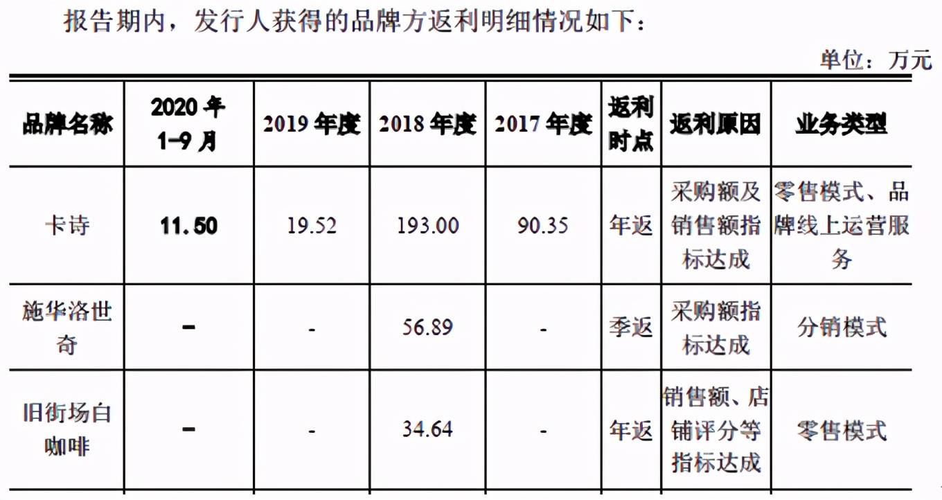 招股说明书“销售及服务模式”则显示,报告期各期,凯淳实业销售的旧街场白咖啡仅在2018年获得品牌方返利,返利金额为34.64万元。