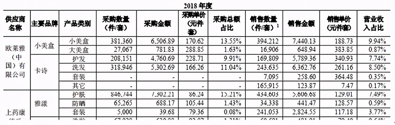而且,招股说明书还强调“上表统计口径为主要供应商对公司主要品牌的商品供应情况”,因此,即便2018年凯淳实业向欧莱雅仅采购了卡诗和小美盒这两个品牌,采购额已经超出了凯淳实业对欧莱雅的采购总额,如果还有其他采购内容,这一超出部分将会更大。
