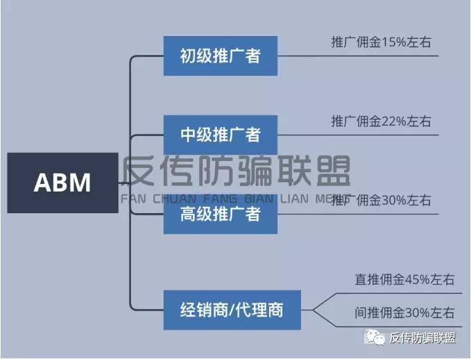 而对应经营者的ABM也分为四级,对应的代理级别为:初级推广者、中级推广者、高级推广者、经销商/代理商。