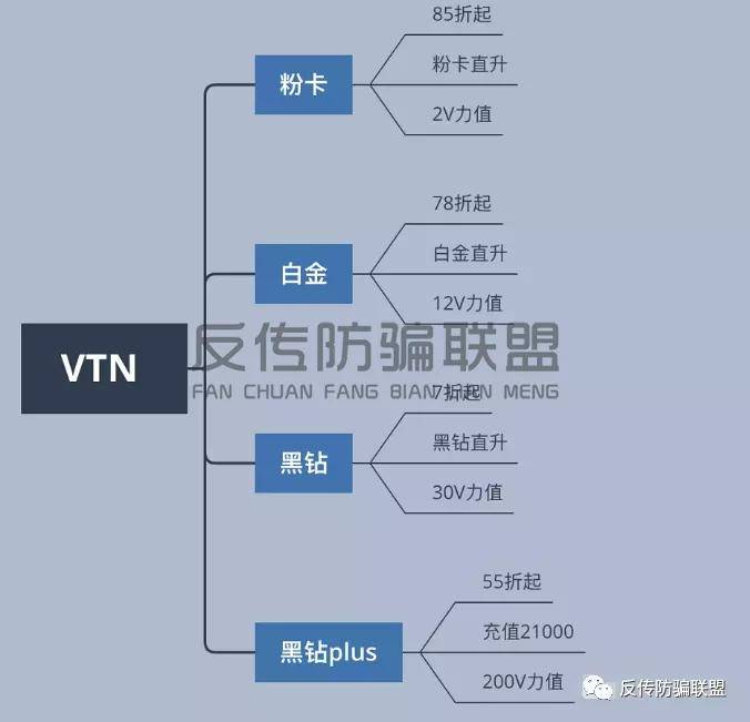 VTN商城的体系一共有4个级别。粉卡,白金卡,黑钻卡,黑钻plus卡,对应的折扣分别是约85折,约78折,约7折、约55折。