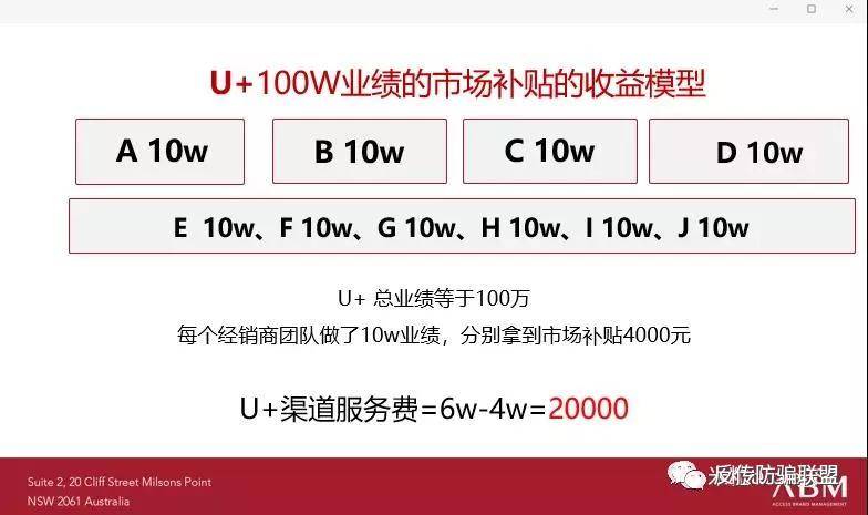 假设你下面有10个经销商,他们分别都做了10万的业绩,共计是100万业绩,按照该档次总共可获得的服务费大概是6万。而这10个经销商,按照10万档分别可获得4千的市场补贴,那么10人总共就是4万,这样你还剩下2万即渠道服务费。假设这10个经销商每月都是如此,那你不用买货即可月赚2万元。如果加上代理商服务费,自己再卖一卖,三五万月收入不成问题。因此要想在ABM赚取更高额的服务费,就要搭建自己的团队。