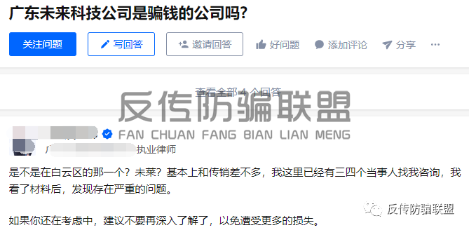 针对该留言,有律师回复:“基本上和传销差不多,我这里已经有三四个当事人找我咨询,我看了材料后,发现存在严重的问题。如果你还在考虑中,建议不要再深入了解了,以免遭受更多的损失。”