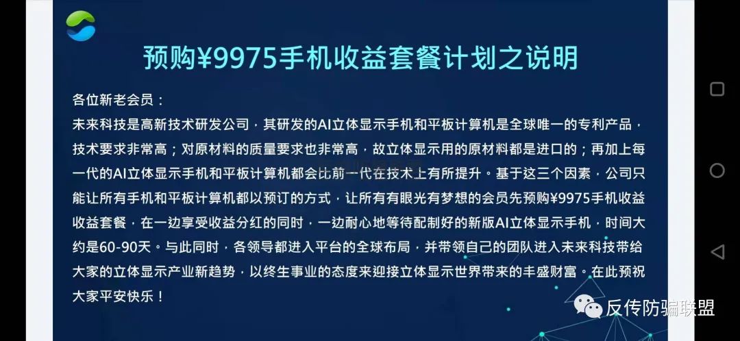 据咨询人透露,未来科技公司所售卖的手机高达9975元一台,价格如何高昂的手机为何购买的人还络绎不绝呢?据反传防骗联盟了解,这与未来科技公司的运营模式有关。
