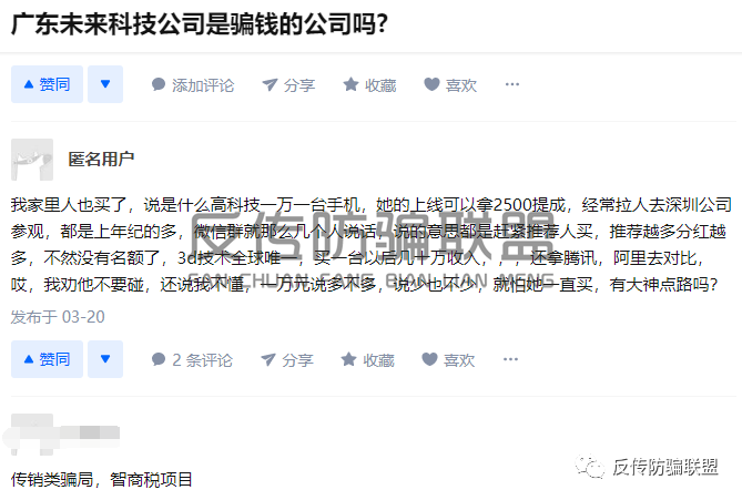 值得一提的是,反传防骗联盟发现网络上有关未来科技公司的质疑并不少,一位网友在某网络平台留言称“我家里人也买了所谓的高科技一万一台的手机,她的上线可以拿2500元提成,经常拉人去深圳公司参观,都是上年纪的多,微信群就那么几个人说话,说的意思都是赶紧推荐人买,推荐越多分红越多,不然没有名额了,3d技术全球唯一,买一台以后几十万收入,还拿腾讯、阿里去对比,我劝他不要碰,还说我不懂,一万元说多不多,说少也不少,就怕她一直买,有大神点路吗?”