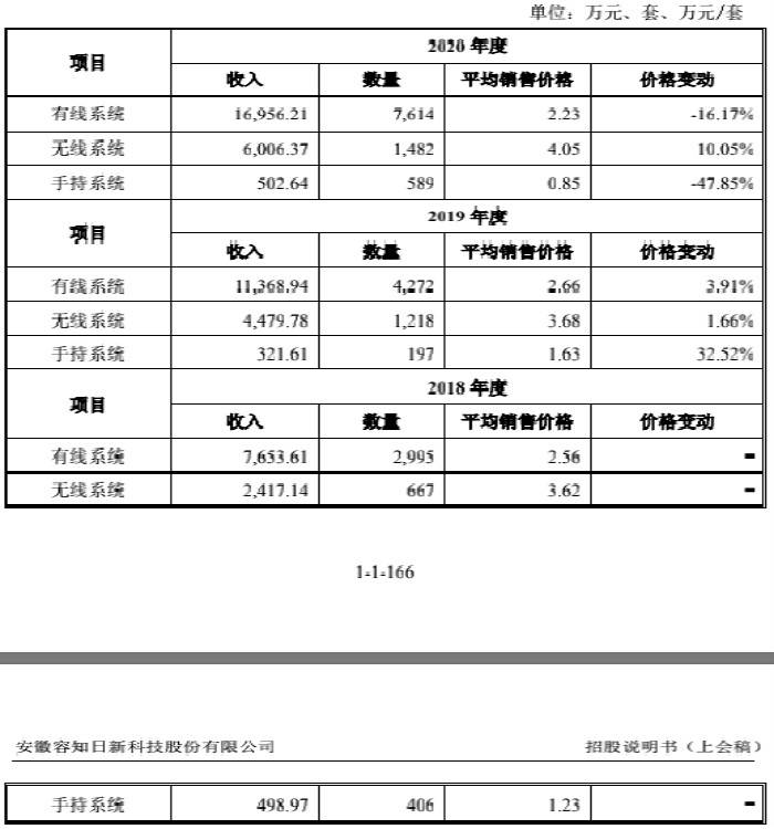 但近几年,容知日新的主要产品的销售价格波动明显。界面新闻记者获悉,2017年至2020年,该公司的有线系统的平均销售价格呈现波动下滑趋势,分别为3.13万元/套、2.56万元/套、2.66万元/套、2.23万元/套。另外,其手持系统产品的平均销售价格也波动明显,2019年、2020年分别是1.63万元/套、0.85万元/套,2020年均价较2019年大跌47.85%。唯有占公司营收两成多的无线系统产品近年来均价较为稳定,2018年至2020年分别是3.63万元/套、3.68万元/套、4.05万元/套。