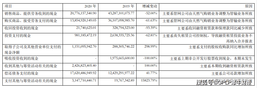 其中,销售商品、提供劳务收到的现金为207.76亿元,同比降52.00%;购买商品、接受劳务支付的现金为138.55亿元,同比降61.63%。申能股份表示,主要是管网公司由天然气购销业务调整为管输业务所致。