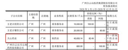 公开资料显示,广州白云山天心制药股份有限公司为白云山控股子公司。白云山日前披露的《2020年年度报告》显示,广州白云山天心制药股份有限公司注册资本4569.31万元,白云山间接持股82.49%。