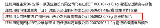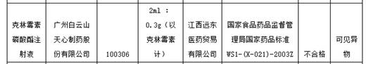 另据中国质量新闻网,广州白云山天心制药股份有限公司曾多次上榜药品不合格名单。比如,浙江省食品药品监督管理局发布的《2007年第5期浙江省药品质量公告》显示,标示广州白云山天心制药股份有限公司生产的注射用头孢呋辛钠(批号:060902)不合格,不合格项目为溶液的颜色。江西省食品药品监督管理局发布的《2010年江西省药品质量公告(基本药物抽验专期第4期)》显示,标示广州白云山天心制药股份有限公司生产的克林霉素磷酸酯注射液(批号:100306)不合格,不合格项目为可见异物。