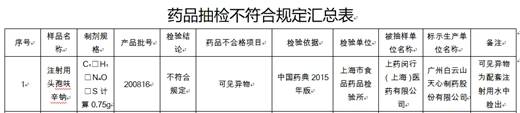 中国经济网北京4月8日讯(记者朱国旺 郭文培) 继被收回GMP证书后,白云山旗下广州白云山天心制药股份有限公司药品再现质量缺陷。日前,上海市药品监督管理局发布的《2021年第1期药品质量抽检通告》显示,经上海市食品药品检验所检验,标示广州白云山天心制药股份有限公司生产的注射用头孢呋辛钠(批号:200816)检出可见异物。