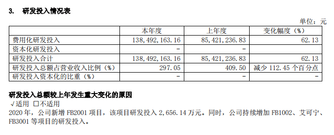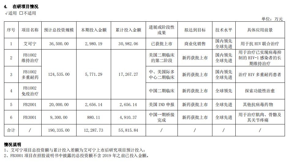 据2020年年报披露的“在研项目情况”显示,艾可宁、FB1002(维持治疗、多重耐药、免疫治疗)、FB2001、FB3001的预计总投资规模19.03亿元,2020年度共投入1.23亿元,累计投入5.58亿元。