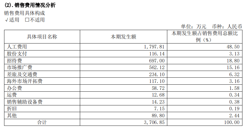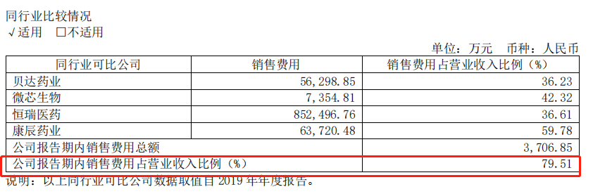 不仅研发费用增长迅速,同期的销售费用也“不甘示弱”,2020年增长至3706.85万元,同比增加84.84%,占营收比例为79.51%。前沿生物称,销售费用增长主要系公司随着销售规模的扩大而增加相应的人工费用、市场推广费等。