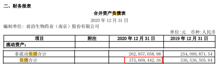 值得关注的是,前沿生物于去年10月科创板上市,募集资金净额为17.17亿元。截至去年年底,前沿生物账面货币资金剩8.39亿元,还面临着3.76亿元的负债总额,其中流动负债1.13亿元,占比约三成。