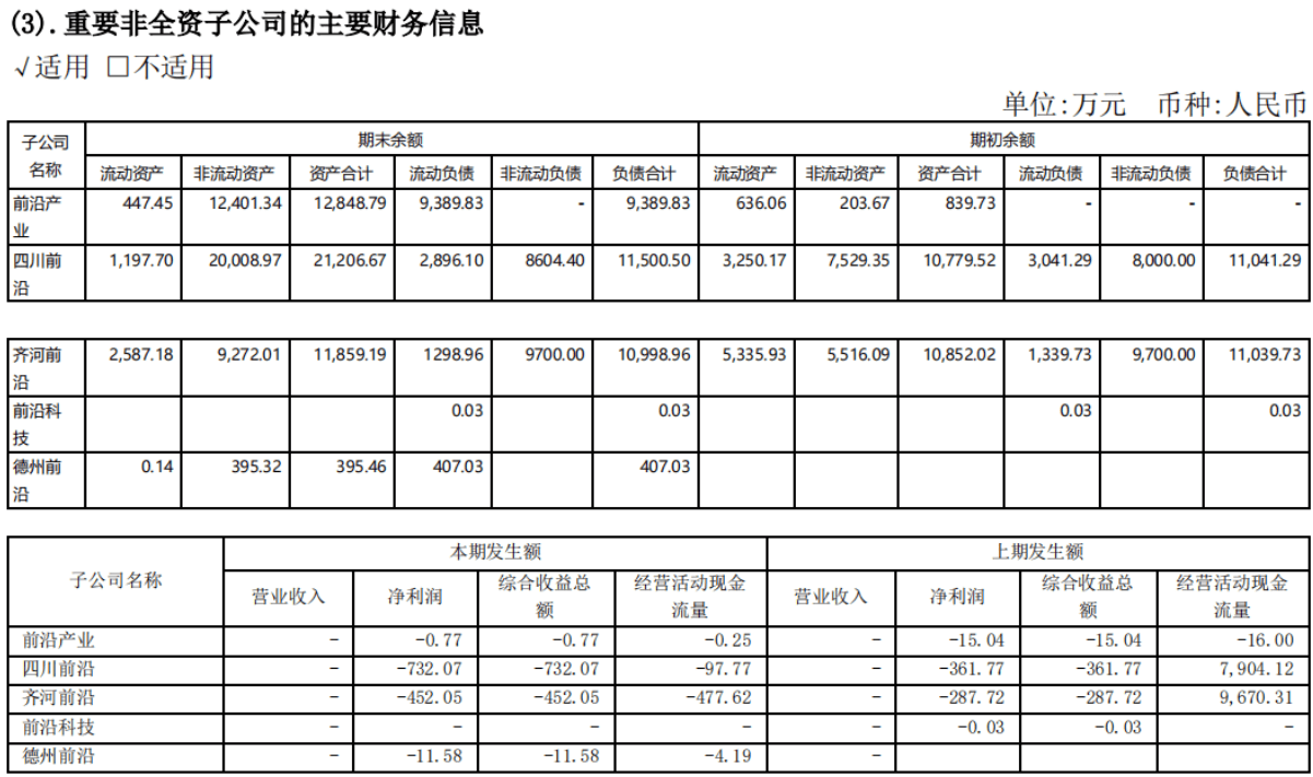 财务数据显示,2020年,前沿产业、四川前沿、齐河前沿、德州前沿4家子公司均亏损,净利润亏损总额超1000万元。
