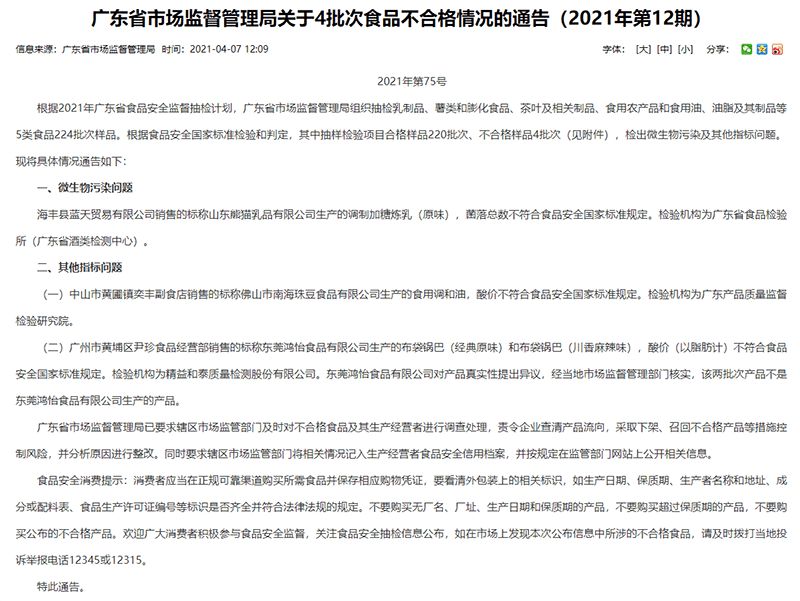 中国网财经4月8日讯 广东省市场监督管理局网站4月7日发布关于4批次食品不合格情况的通告(2021年第12期),通告显示,广东省市场监督管理局组织抽检乳制品、薯类和膨化食品、茶叶及相关制品、食用农产品和食用油、油脂及其制品等5类食品224批次样品。根据食品安全国家标准检验和判定,其中抽样检验项目合格样品220批次、不合格样品4批次,检出微生物污染及其他指标问题。