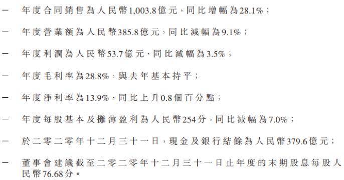 同时,该公司毛利也由2019年的124.4亿元降至2020年的111.0亿元,减少13.4亿元,降幅达10.7%。2020年28.8%的毛利率亦较上年的29.3%减少0.5个百分点。该公司称,毛利率下滑主要因产品收入确认比例较2019年下降所致。