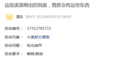 4月3日,黑猫投诉平台数据显示,一位用户表示,自己刚刚买了两桶泡面,在一桶差不多吃完了的时候竟然发现了指甲,目前此条投诉显示正在处理中。