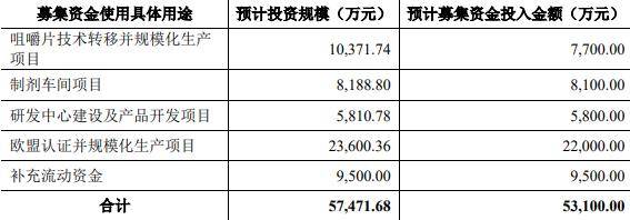 海默尼原拟在深交所创业板公开发行股票数量不低于4000.00万股,占发行后总股本比例不低于10.00%,发行不涉及股东公开发售股份,拟募集资金5.31亿元,其中7700万元用于咀嚼片技术转移并规模化生产项目,8100万元用于制剂车间项目,5800万元用于研发中心建设及产品开发项目,2.20亿元用于欧盟认证并规模化生产项目,9500万元用于补充流动资金。