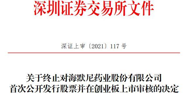 2021年4月6日,海默尼向深交所提交了《海默尼药业股份有限公司关于撤回首次公开发行股票并在创业板上市申请文件的申请》,保荐人华西证券提交了《关于撤回海默尼药业股份有限公司首次公开发行股票并在创业板上市申请文件的申请》。根据《深圳证券交易所创业板股票发行上市审核规则》第六十七条的有关规定,深交所决定终止对海默尼首次公开发行股票并在创业板上市的审核。