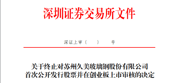 2021年3月30日,久美股份向深交所提交了《苏州久美玻璃钢股份有限公司关于撤回首次公开发行股票并在创业板上市申请文件的申请》,保荐人向深交所提交了《兴业证券股份有限公司关于撤回苏州久美玻璃钢股份有限公司首次公开发行股票并在创业板上市申请文件的申请》。根据《深圳证券交易所创业板股票发行上市审核规则》第六十七条的有关规定,深交所决定终止对久美股份首次公开发行股票并在创业板上市的审核。