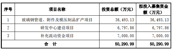 久美股份原拟在深交所创业板公开发行股票数量不超过3275.00万股,公开发行的新股不低于本次发行后总股本的25%,拟募集资金5.03亿元,其中3.65亿元用于玻璃钢管道、附件及模压制品扩产项目,6797.86万元用于研发中心建设项目,7000.00万元用于补充流动资金项目。