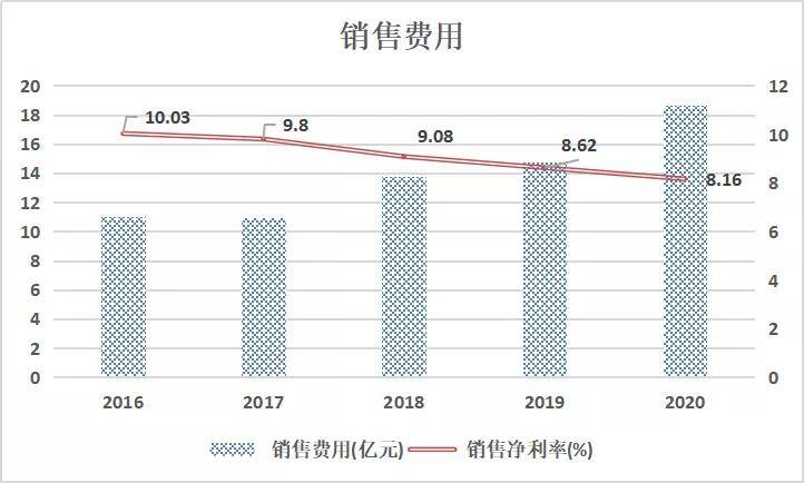 数据显示,2016-2020年以来,九阳股份的销售费用金额一直呈趋势性上升,同期九阳股份的销售净利率则呈反向趋势性下滑,2016-2020年公司销售净利率分别为10.03%、9.80%、9.08%、8.62%、8.16%。