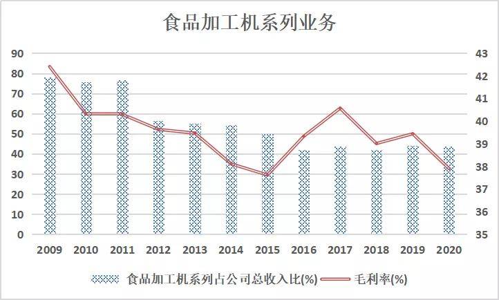 此外,食品加工机系列产品毛利率持续滑坡,再一次表明了公司产品竞争能力正在逐步弱化,在市场竞争中处于不利地位。