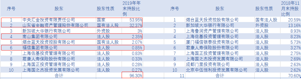 据《恒丰银行2019年度同业存单发行计划》披露,截至2018年11月,大华银行持股13.16%,为此前恒丰银行的第二大股东。引入战投后,恒丰银行原前十大股东大换血。2019年末,中央汇金以53.95%的持股比例成为恒丰银行第一大股东,其次为山东省资管,持股32.37%。