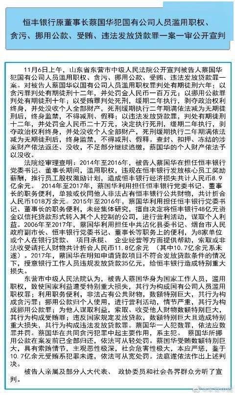 据山东省东营市中级人民法院官方微博消息,11月6日,恒丰银行股份有限公司(简称“恒丰银行”)原董事长蔡国华被控犯国有公司人员滥用职权、贪污、挪用公款、受贿、违法发放贷款罪,多项罪名成立,涉案金额超过103亿元。数罪并罚,法院决定执行死刑,缓期两年执行,并处没收个人全部财产。