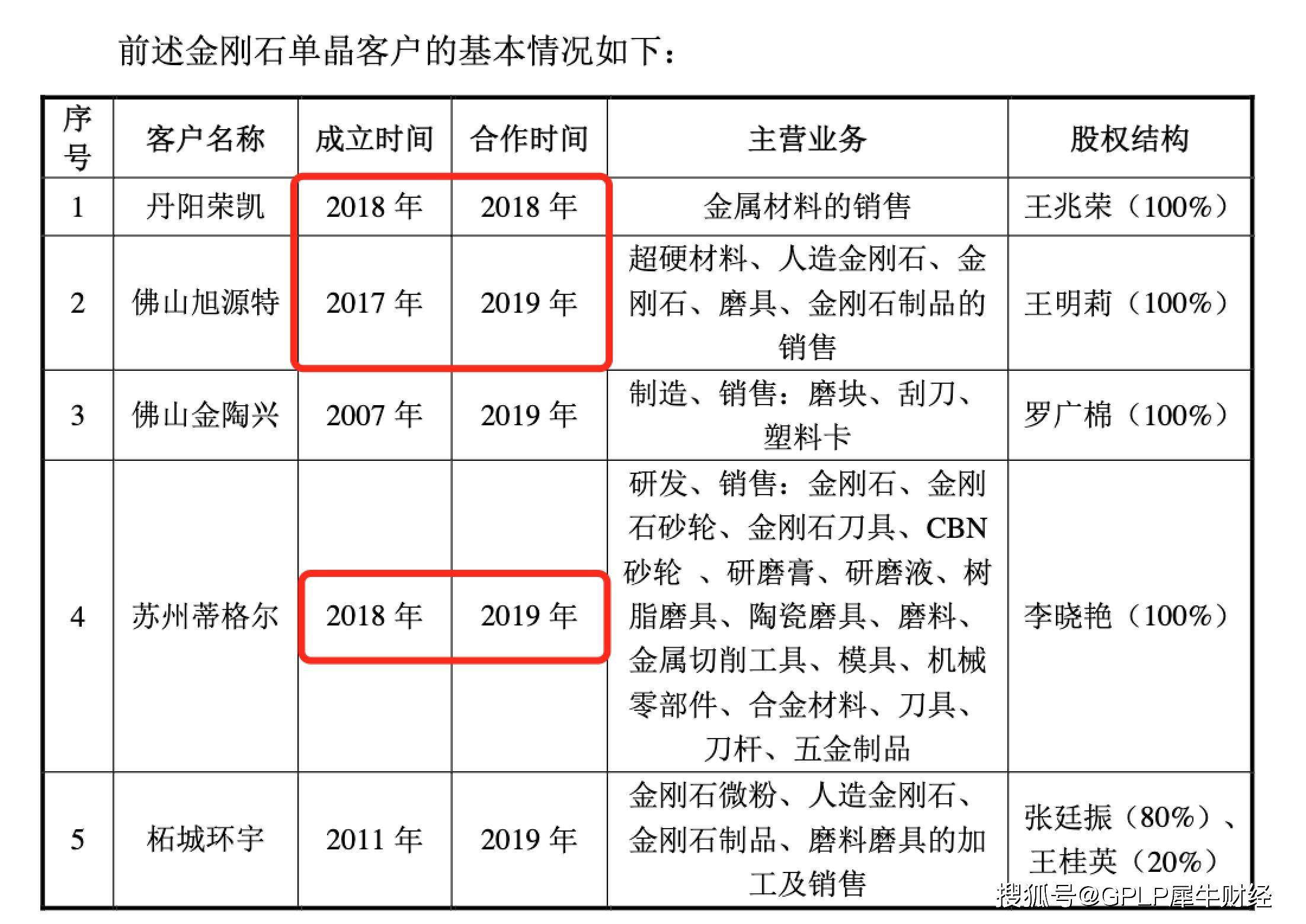 此外,2019年,力量钻石还新增了4家金刚石单晶客户,其中佛山旭源特刚成立2年,注册资本100万元,实缴资本也为0;苏州蒂格尔,成立仅1年;柘城环宇的从业人数为10人。