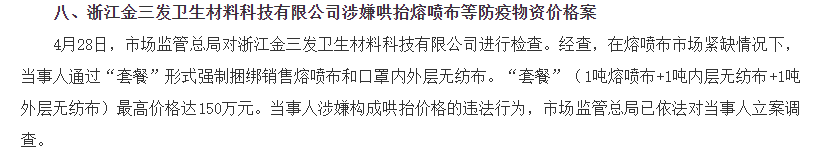 2020年5月20日,市场监管总局发布第十一批疫情防控期间哄抬熔喷布等防疫物资价格违法行为典型案件,其中第八条显示,市场监管总局在4月28日对金三发卫材进行了检查。经查,优全护理子公司金三发卫材在熔喷布市场紧缺情况下,通过“套餐”形式强制捆绑销售熔喷布和口罩内外层无纺布。“套餐”(1吨熔喷布+1吨内层无纺布+1吨外层无纺布)最高价格达150万元。涉嫌构成哄抬价格的违法行为,市场监管总局依法对当事人立案调查。