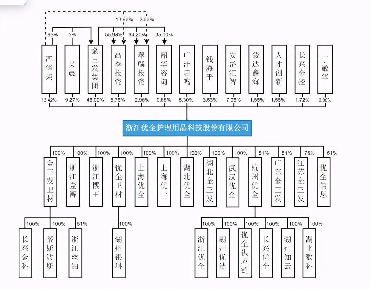 优全护理1.7亿元的现金分红额甚至超过了2019年度与2018年度的归母净利润之和。招股书显示,严华荣直接持有优全护理13.42%的股权,严华荣配偶吴晨直接持有公司9.27%的股权,严华荣、吴晨通过金三发集团间接持有公司46.09%的股权,通过高季投资间接控制公司5.76%的股权、通过翠麟投资间接控制公司2.98%的股权、通过韶华咨询间接控制公司0.88%的股权。严华荣、吴晨合计控制优全护理78.4%的股权,严华荣、吴晨为公司实际控制人。