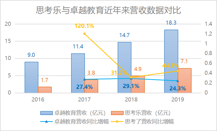 也有分析指出,虽然思考乐教育与卓越教育之间有极大的营收差距,但过去三年,而卓越教育的营收年化复合增长率仅为26.9%,与思考乐实现的60.9%相比,从业绩增长角度,思考乐教育有更高的增长潜力。
