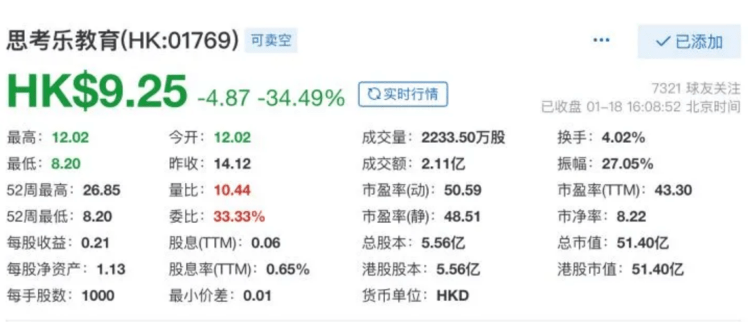 思考乐教育业绩预警:股价遭遇大跳水 泡沫破了?