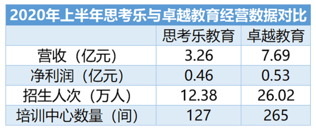 2020年上半年,卓越教育实现营收7.69亿元,是思考乐同期营收的两倍有余;招生人次达26.02万人,是思考乐同期12.38万招生人次的两倍多;培训中心数量达265间,也是思考乐截至同期127间培训中心数量的两倍有余。
