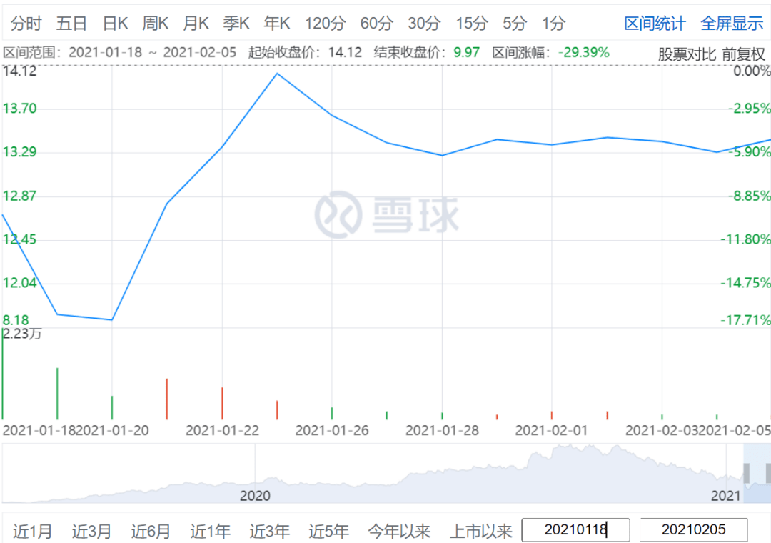 而从股价走势上看,此次盈利预警的不利影响似乎仍在持续,从1月18日至2月5日,短短15天,已经跌下近3成。