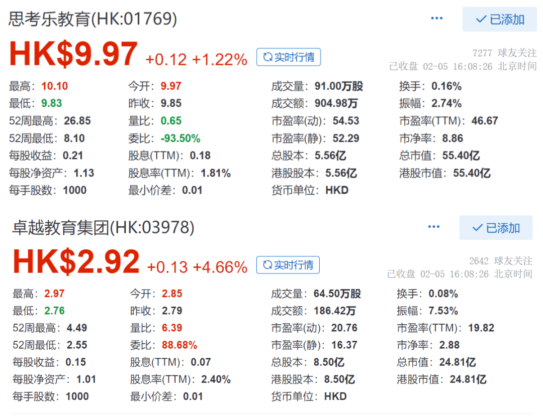 资本市场给予的估值也是肉眼可见的高。截至2月5日收盘,思考乐总市值55.40亿港元,是卓越教育24.81亿港元总市值的两倍多。静态市盈率52.29倍,是卓越教育的三倍多。