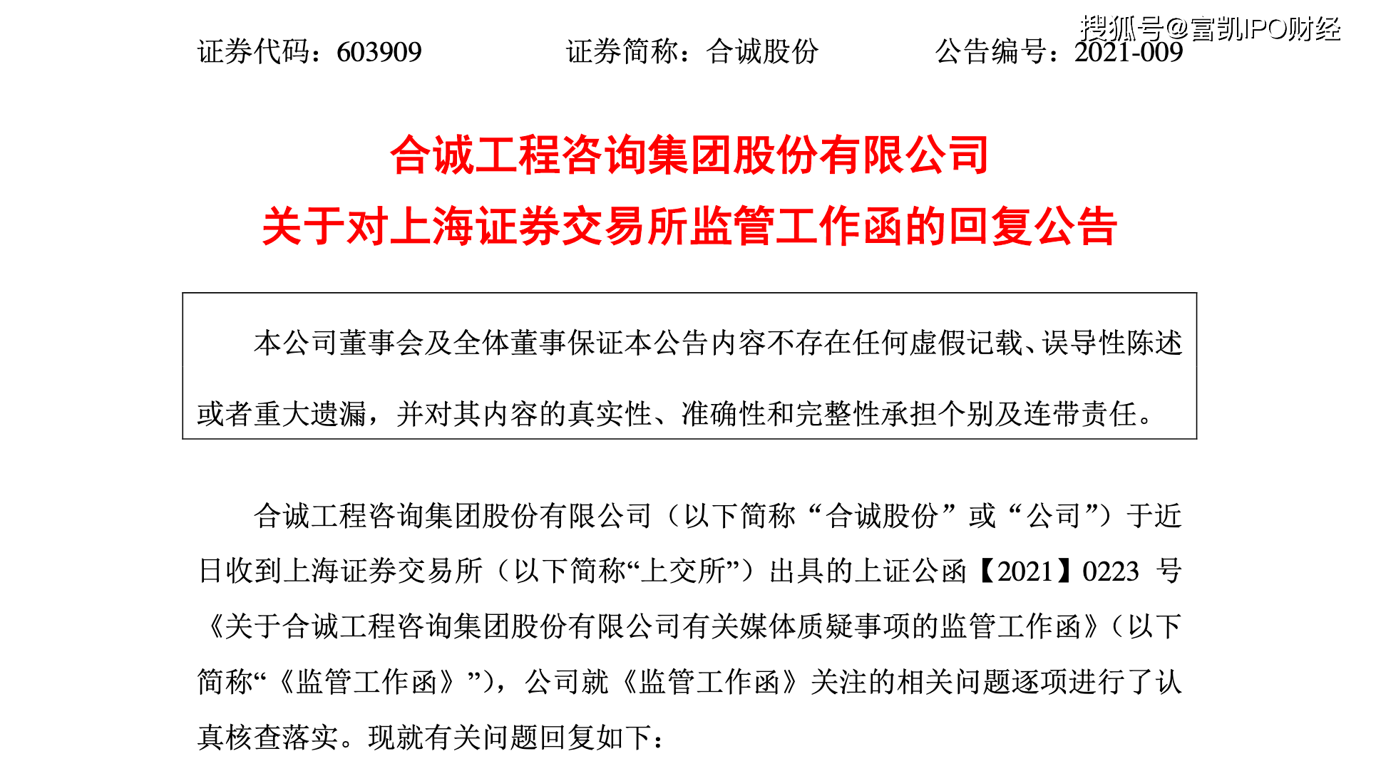 3月30日,合诚股份发布了《关于对上海证券交易所监管工作函的回复公告》,披露该公司“于近日收到上海证券交易所(以下简称“上交所”)出具的上证公函【2021】0223号”,在这份《监管工作函》中,上交所明确提到“有媒体报道称,公司前期收购福建怡鹭工程有限公司(以下简称福建怡鹭)交易涉嫌隐瞒关联关系,且公司高管与主要交易对手刘向东在收购前发生过资金往来”。而合诚股份也就《监管工作函》关注的相关问题作出回复。 制图:富凯IPO财经 来源:合诚股份公告