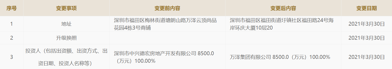 深圳市玉龙宫实业发展有限公司工商信息显示,其发生股权变更,原全资股东深圳市中兴德宏房地产开发有限公司退出,新增股东万泽集团有限公司。
